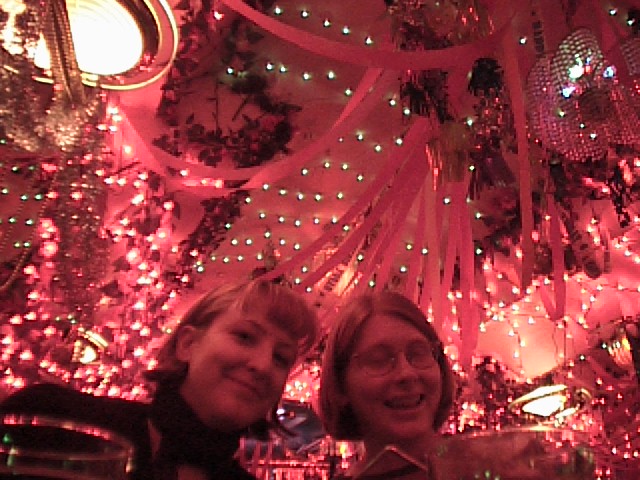 this is erika with her friend, who's name eludes me. this was an indian restaura nt illuminated solely with red xmas lights.