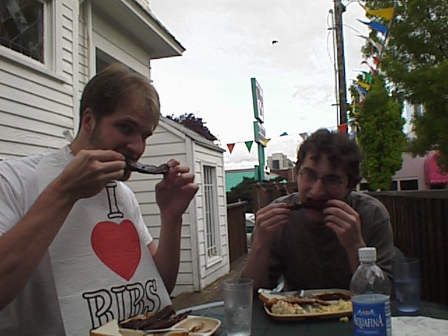 in portland! eating ribs! mmm, ribs. the management brought gus a bib - they just knew he needed it.