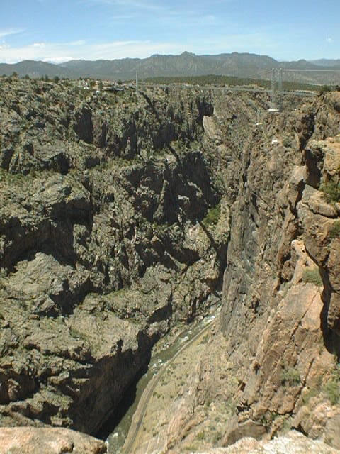 this is a really deep gorge - "royal gorge." those are train tracks at the bottom. it is actually a tourist trap - it costs $14 to walk out on the bridge.